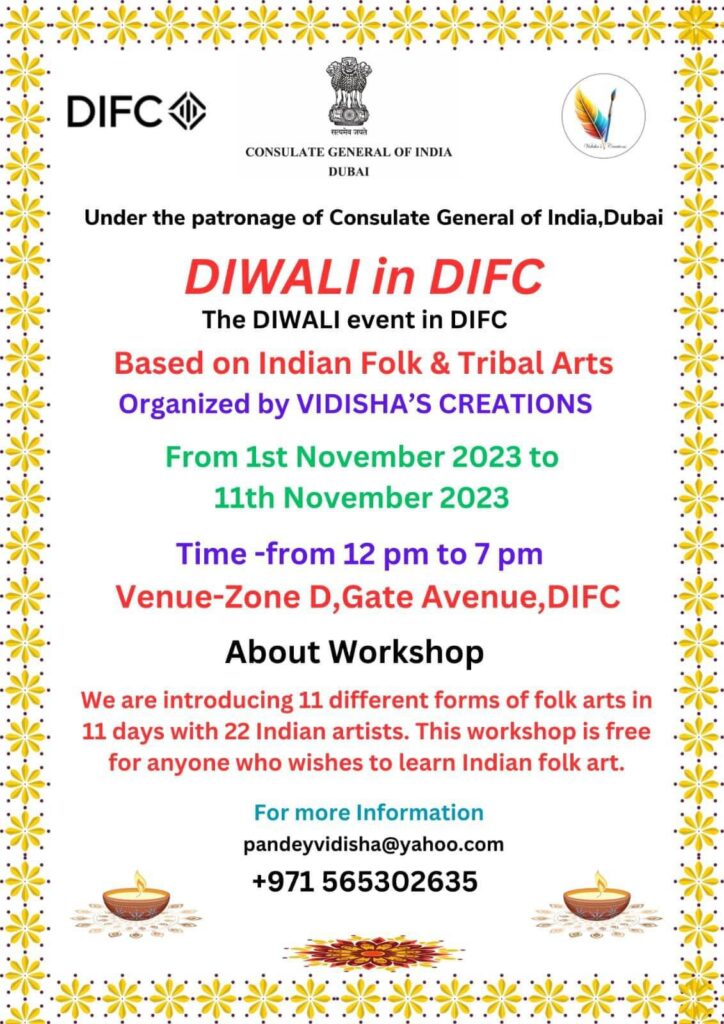 We are delighted to inform everyone that, under the patronage of the INDIAN CONSULATE we will be celebrating Diwali along with Indian folk arts at Gate Avenue, D Zone, DIFC.