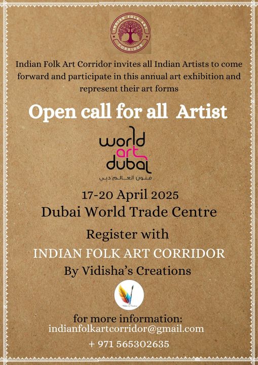 Pleased to extend an invitation to you to join Indian Folk Art Corridor by Vidisha’s Creations at the 11th edition of World Art Dubai,UAE’s affordable art fair. It will take place at the Dubai World Trade Centre from April 17 to 20, 2025.
