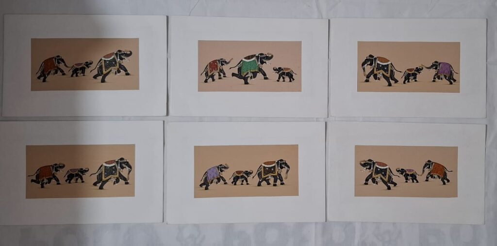 Immerse yourself in the finesse of traditional Rajasthani miniature art with this stunning “Elephant Family” painting by Mahendra Pahadiya. Painstakingly created with fine brushwork and natural pigments, this 9×5 inch masterpiece captures the regal presence and tender bond of an elephant herd. A celebration of heritage and detail, perfect for collectors of fine Indian art.