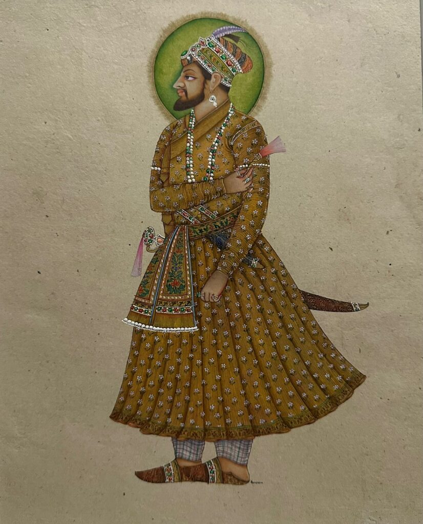 Golden Court Chronicle by Ravi Kumawat is a deeply traditional painting that echoes the legacy of the Indian Mughal empire. Crafted on handmade paper using hand-ground stone pigments mixed with natural gum, the piece features real gold accents that elevate its regal energy. Each detail was painted using squirrel-hair brushes over two painstaking months, making it a collectible artwork grounded in cultural finesse and royal tribute.