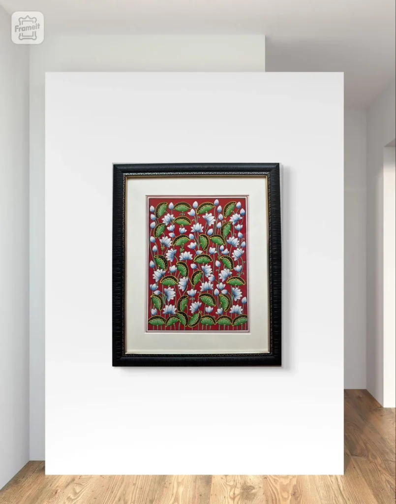 The “Kamal Taal” painting showcases the elegance of Pichwai art, a traditional Indian art form that depicts divine themes. Featuring delicate lotus motifs, this artwork embodies devotion, serenity, and spiritual depth, making it a timeless piece of art.