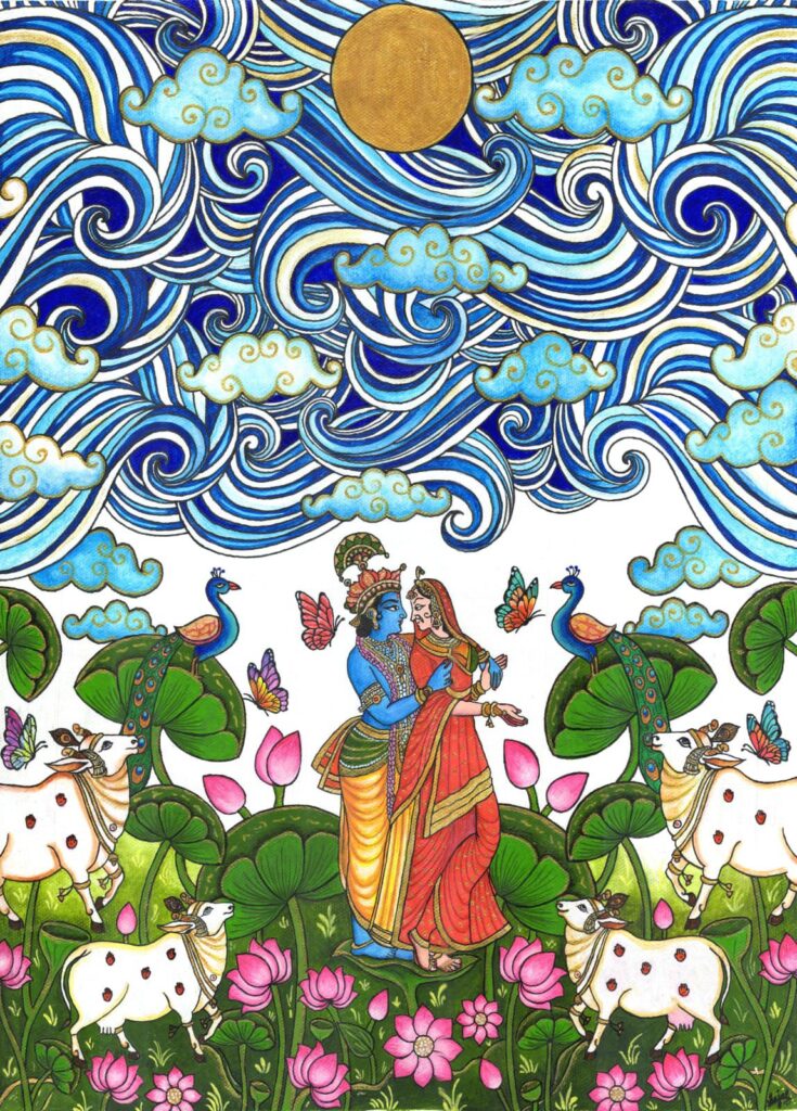 Rendered in a contemporary Pichwai style using acrylics, the artwork balances tradition with a fresh visual softness, making it both spiritually evocative and aesthetically refined.