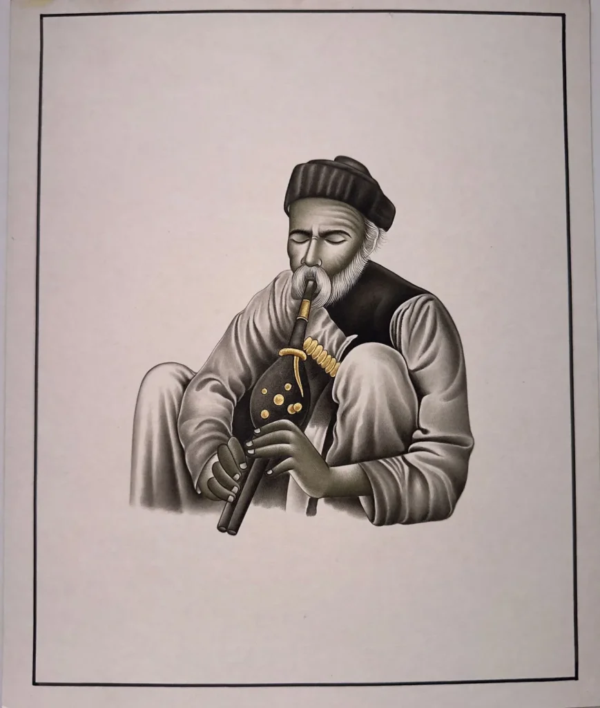 The “Madwadi Musician” painting in Miniature Art style celebrates the cultural richness of traditional Indian musicians, depicted with intricate detailing and vibrant colors. This artwork captures the rhythm and spirit of music, offering a glimpse into the joy of folk traditions.
