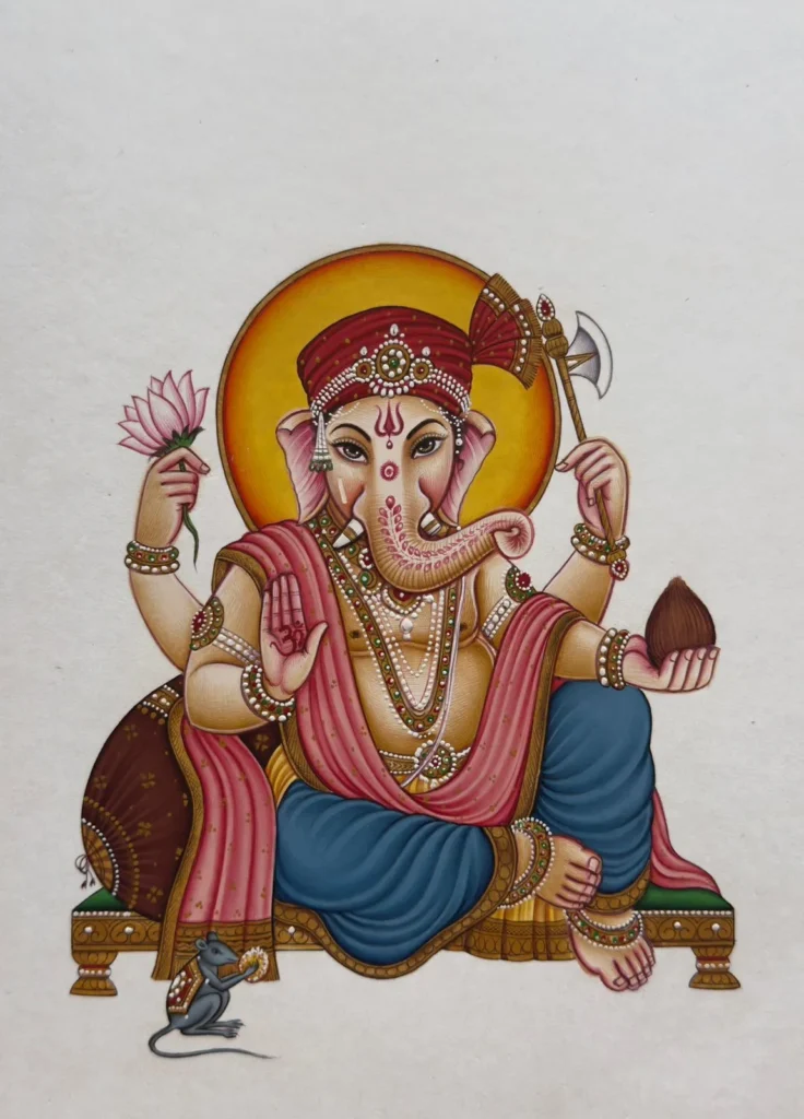 The “Vibrant Form” Miniature Lord Ganesh Painting is an explosion of color, celebrating the joyful and vibrant spirit of Ganesha. The intricate patterns and bright hues make this artwork an eye-catching addition to any space.