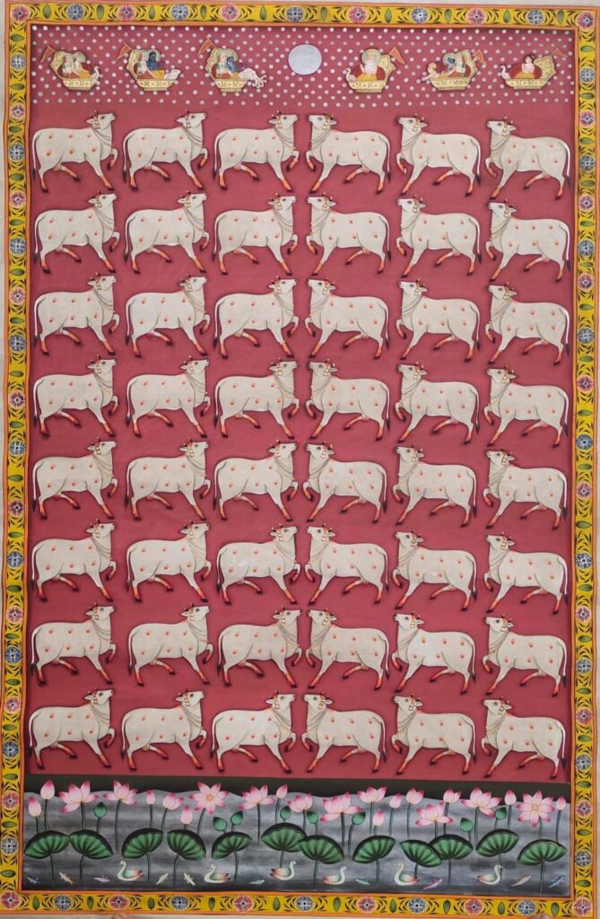 Celebrate the grace of divine art with this Pichwai Cow painting, created using age-old techniques on cotton fabric with natural stone colors. Its 3 x 4 feet size makes it a statement piece, blending culture with elegance.