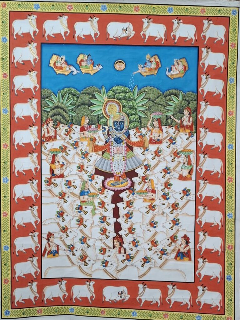 A classic Pichwai in Nathdwara tradition, this artwork evokes the divine charm of Krishna as Gopal. Ideal for collectors of devotional art and lovers of intricate miniature traditions.