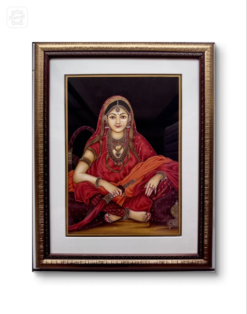 The “Queen” in Miniature Art beautifully portrays the elegance and grace of Indian royalty, with intricate designs that reflect the splendor of traditional miniature painting. This artwork captures the regal poise and timeless beauty of queenship in meticulous detail.