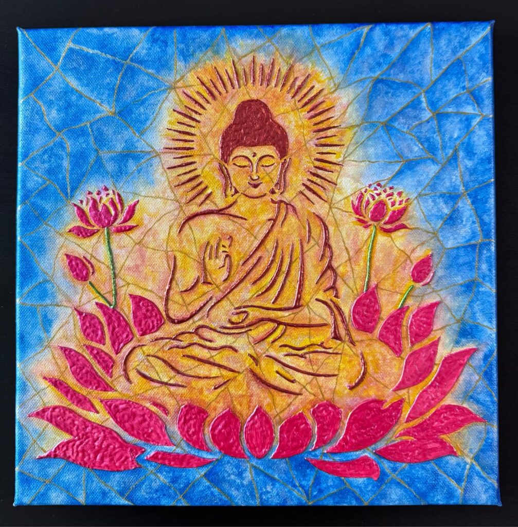 The lotus flowers, also crafted with texture paste, rise gently around the Buddha. Their soft pink tones represent purity and spiritual awakening emerging from the depths of life’s experiences.