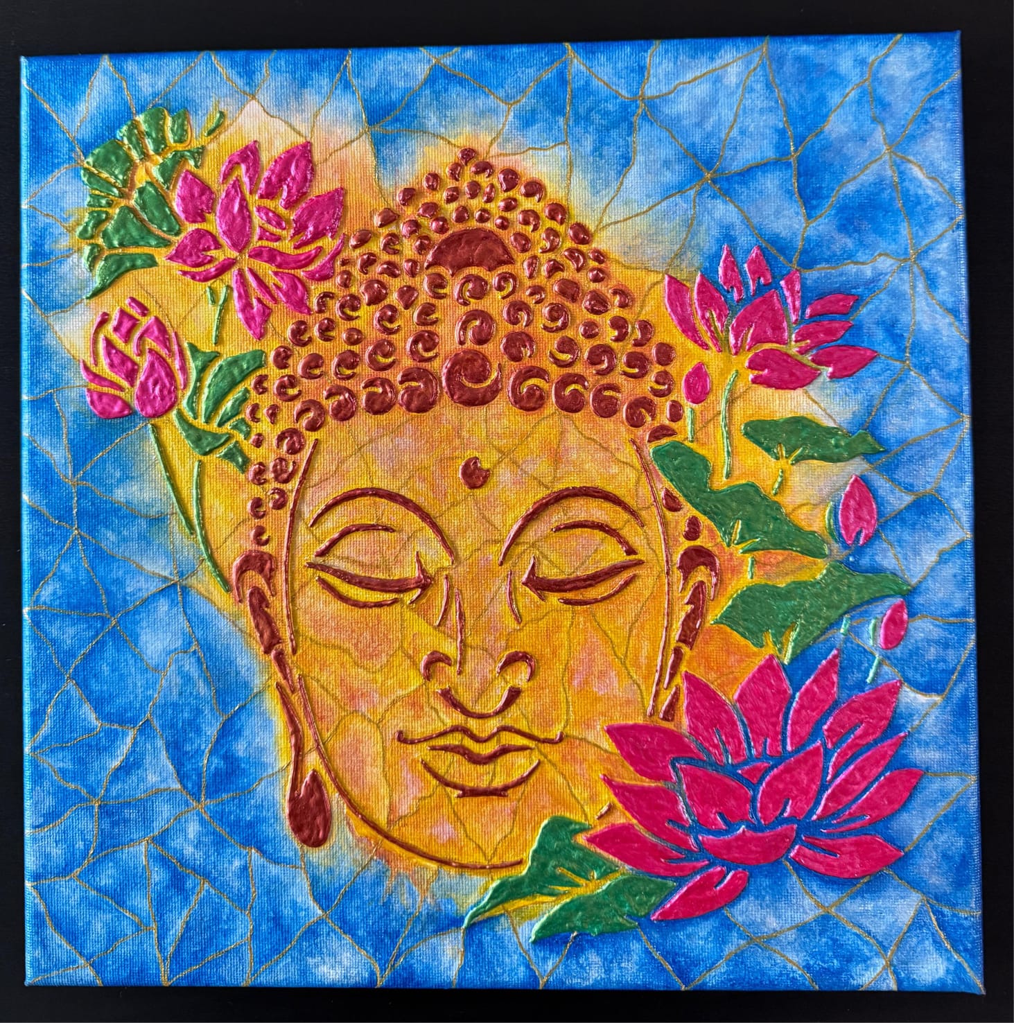 Lotus flowers and leaf motifs, also crafted with texture paste, add depth and dimension to the composition. The soft pink lotuses symbolize purity emerging from life’s depths, while the leaves represent growth, grounding, and interconnectedness.